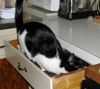 What do they mean I have to be wordless on Wednesday? That's just not possible. I have lotsa things to say. I have learned how to jump up high and land on things very quietly and delicately. (Of course Mom says I can also run around like a herd of elephants.) Here I am sitting on top of the picture box with this little Schwag-y penguin. As you can see we are both perfectly dressed Tuxedos. Except I don't have red lettering across my belly. Good thing.Mom refilled my favorite mousie with Cosmic Catnip so I've been batting it all over the place, and running around with it in my mouth. It's been great fun.
