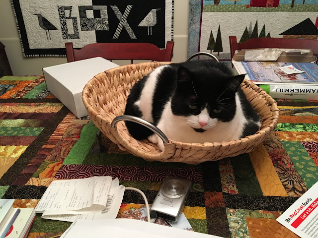 When Mom gets a quilt back from an AQS show, it comes with a label. Mom sews it to the back of the quilt. The Chicken quilt came home this past week with four labels for Mom to sew.